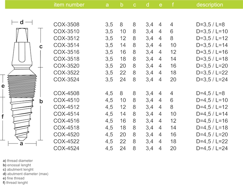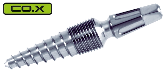 CO-X is a one-piece implant with a self-tapping fine thread and a coarse thread, with a conically shaped screw in the bone region. The special thread form permits the application as a quadruple cortex-screw.